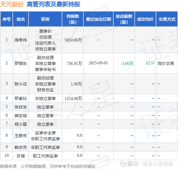天元股份近半年内的董监高及核心技术人员增减持详情如下: