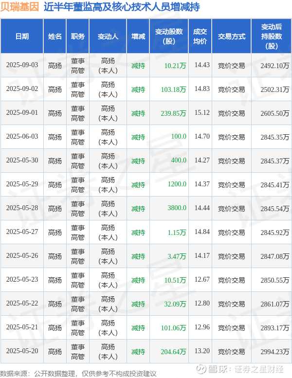 贝瑞基因近半年内的董监高及核心技术人员增减持详情如下: