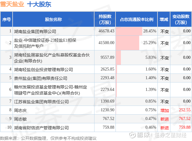 根据雪天盐业2025年中报公布的十大股东详情如下: