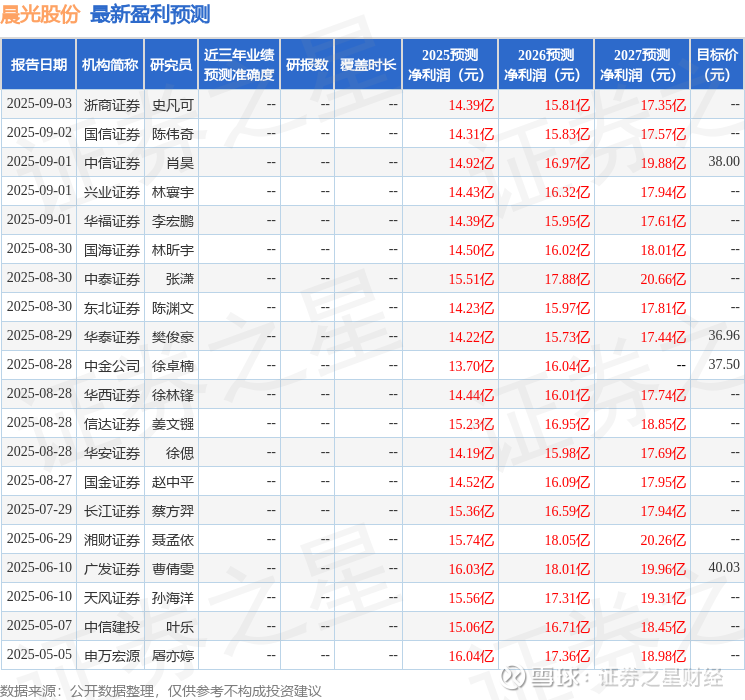 最新盈利预测明细如下: