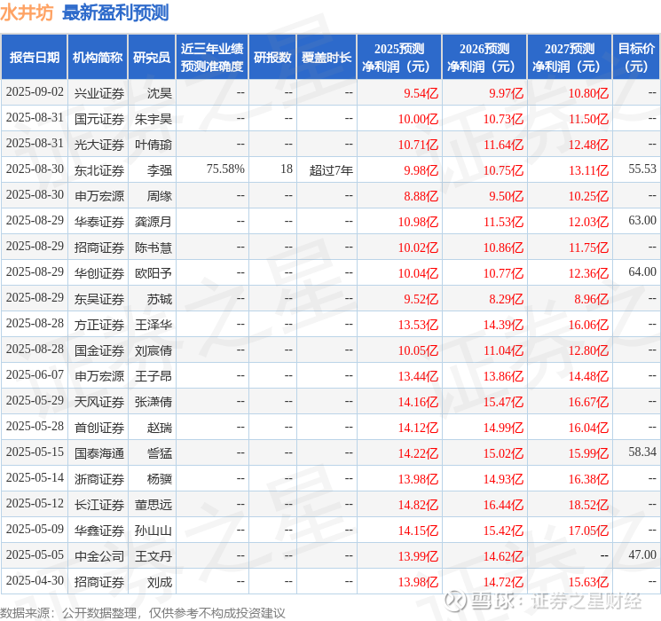 西南证券股份有限公司朱会振,王书龙,杜雨聪近期对水井坊进行研究并发布了研究报告《2025年中报点评:25Q2业绩短期承压,静待需求复苏》,给予水井坊买入评级,目标价61.5元。