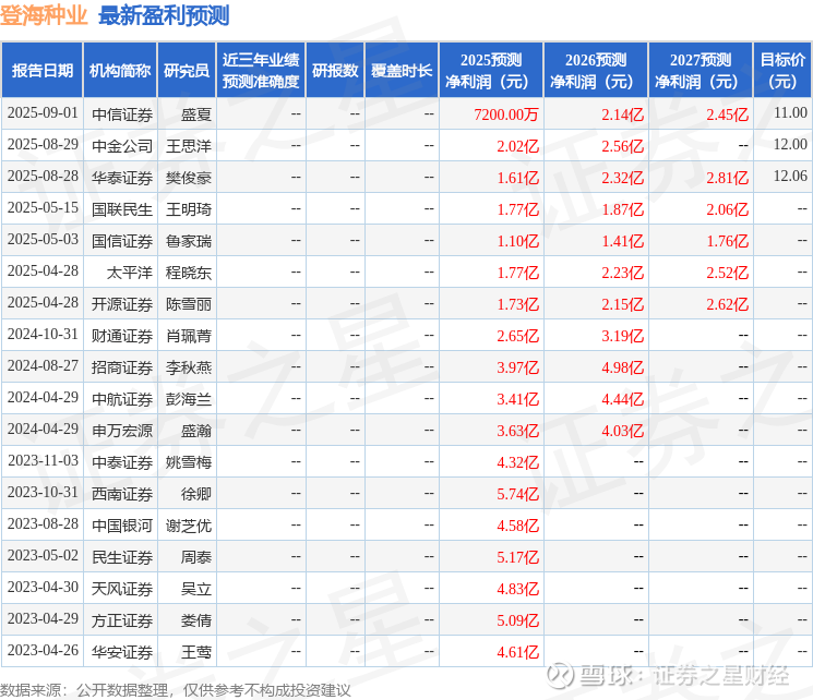 最新盈利预测明细如下: