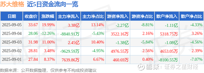 9月5日的资金流向数据方面,主力资金净流入3.38亿元,占总成交额13.14%,游资资金净流出2.27亿元,占总成交额8.81%,散户资金净流出1.11亿元,占总成交额4.33%。