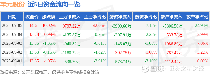 证券之星消息,丰元股份9月5日涨停收盘,收盘价14.61元。该股于9点34分涨停,未打开涨停,截止收盘封单资金为1.11亿元,占其流通市值2.72%。