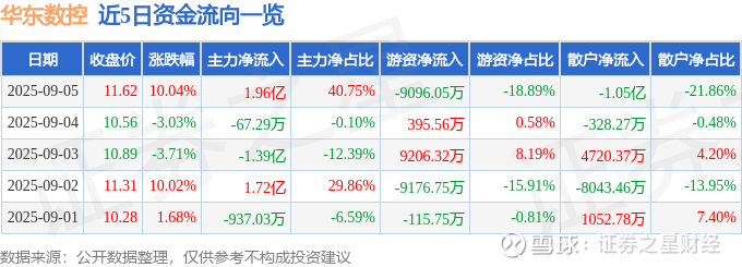 证券之星消息,华东数控9月5日涨停收盘,收盘价11.62元。该股于9点56分涨停,未打开涨停,截止收盘封单资金为1.89亿元,占其流通市值5.28%。
