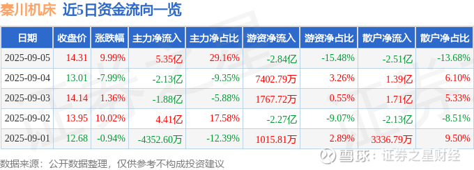 证券之星消息,秦川机床9月5日涨停收盘,收盘价14.31元。该股于9点57分涨停,2次打开涨停,截止收盘封单资金为1.23亿元,占其流通市值0.86%。