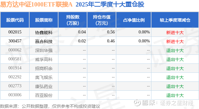 根据2025基金半年报公募基金重仓股数据,重仓该股的公募基金共1家,其中持有数量最多的公募基金为易方达基金的易方达中证1000ETF联接A。易方达中证1000ETF联接A目前规模为2.35亿元,最新净值0.9963(9月4日),较上一交易日下跌2.21%,近一年上涨48.19%。该公募基金现任基金经理为刘树荣 庞亚平。刘树荣在任的基金产品包括:易方达深证100ETF联接A,管理时间为2017年7月18日至今,期间收益率为53.56%;易方达创业板ETF联接A,管理时间为2017年7月18日至今,期间收益率为72.33%;易方达深证100ETF,管理时间为2017年7月18日至今,期间收益率为52.84%;易方达创业板ETF,管理时间为2017年7月18日至今,期间收益率为80.05%。庞亚平在任的基金产品包括:易方达沪深300ETF联接A,管理时间为2022年12月15日至今,期间收益率为19.83%;易方达沪深300发起式ETF,管理时间为2022年12月15日至今,期间收益率为21.38%;易方达中证500ETF联接发起式A,管理时间为2022年12月17日至今,期间收益率为18.06%;易方达中证500ETF,管理时间为2022年12月17日至今,期间收益率为20.22%。