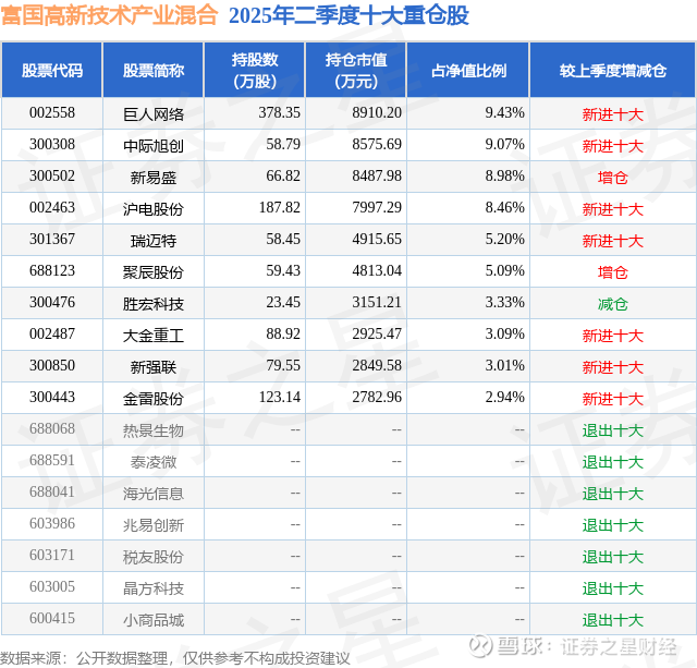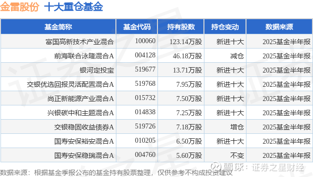 根据2025基金半年报公募基金重仓股数据,重仓该股的公募基金共9家,其中持有数量最多的公募基金为富国基金的富国高新技术产业混合。富国高新技术产业混合目前规模为9.45亿元,最新净值3.191(9月4日),较上一交易日下跌4.58%,近一年上涨62.39%。该公募基金现任基金经理为李元博。
