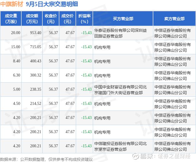 证券之星消息,9月5日中旗新材发生大宗交易,交易数据如下: