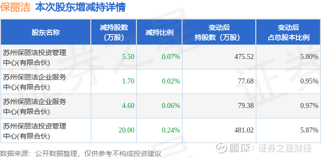 证券之星消息,9月5日保丽洁发布公告《保丽洁:关于控股股东、实际控制人及一致行动人权益变动触及1%整数倍的提示性公告》,其股东苏州保丽洁投资管理中心(有限合伙)、苏州保丽洁企业服务中心(有限合伙)于2025年9月1日至2025年9月5日间合计减持31.8万股,占公司目前总股本的0.3878%,变动期间该股股价上涨9.44%,截止9月5日收盘报20.76元。