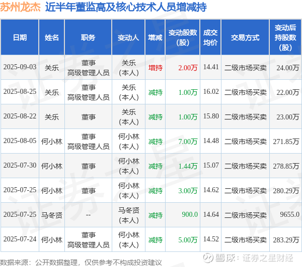 苏州龙杰近半年内的董监高及核心技术人员增减持详情如下:
