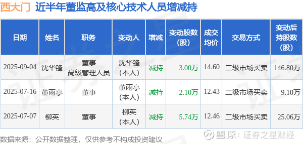 西大门近半年内的董监高及核心技术人员增减持详情如下: