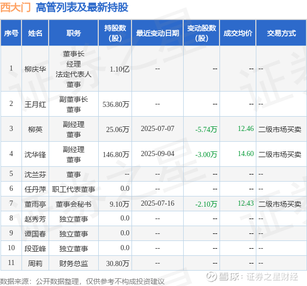 西大门的高管列表及最新持股情况如下: