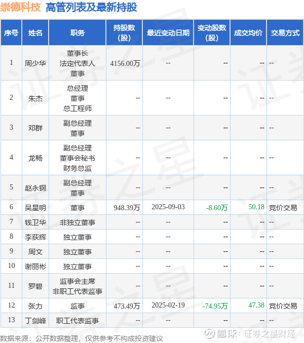 崇德科技近半年内的董监高及核心技术人员增减持详情如下: