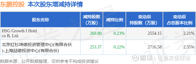 证券之星消息,9月5日东鹏控股发布公告《东鹏控股:关于公司股东减持计划期限届满暨实施情况的公告》,其股东HSG Growth I Holdco B, Ltd.、北京红杉坤德投资管理中心(有限合伙)-上海喆德投资中心(有限合伙)于2025年6月24日至2025年7月11日间合计减持514.17万股,占公司目前总股本的0.4444%,变动期间该股股价上涨4.5%,截止7月11日收盘报5.81元。