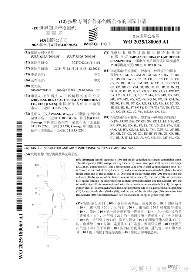 证券之星消息,根据企查查数据显示盾安环境(002011)公布了一项国际专利申请,专利名为“油分离器及其空调系统”,专利申请号为PCT/CN2024/144151,国际公布日为2025年9月4日。