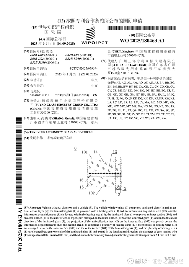 证券之星消息,根据企查查数据显示福耀玻璃(600660)公布了一项国际专利申请,专利名为“一种车窗玻璃及车辆”,专利申请号为PCT/CN2025/079694,国际公布日为2025年9月4日。