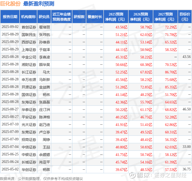 最新盈利预测明细如下: