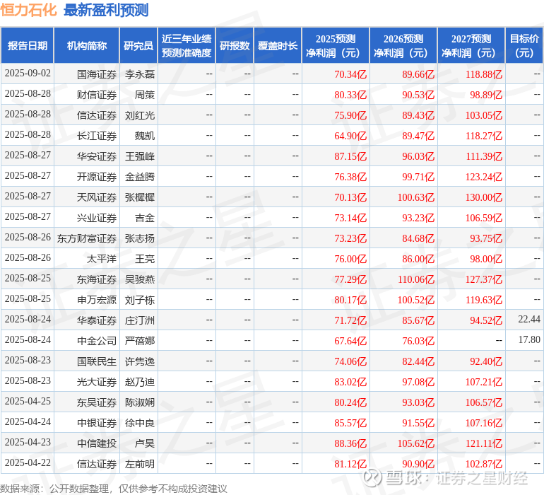最新盈利预测明细如下: