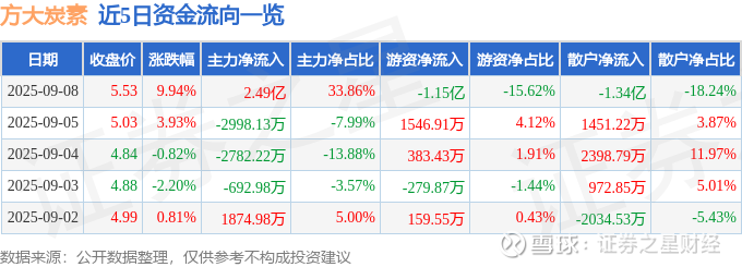 9月8日的资金流向数据方面,主力资金净流入2.49亿元,占总成交额33.86%,游资资金净流出1.15亿元,占总成交额15.62%,散户资金净流出1.34亿元,占总成交额18.24%。