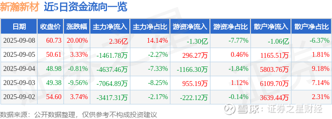 证券之星消息,新瀚新材9月8日涨停收盘,收盘价60.73元。该股于11点24分涨停,未打开涨停,截止收盘封单资金为1.54亿元,占其流通市值2.31%。