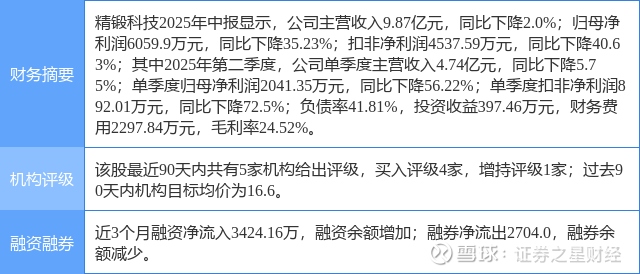 2025年8月26日,民生证券研究员崔琰,马天韵发布了对精锻科技的研报《系列点评四:25Q2业绩短期承压 机器人打开第二成长曲线》,该研报对精锻科技给出“买入”评级。研报中预计2025-2027年收入分别22.2/28.0/35.4亿元,归母净利润分别1.9/2.5/3.2亿元,EPS分别0.33/0.42/0.54元,对应2025年8月25日14.89元/股收盘价,PE分别为46/35/28倍,维持“推荐”评级。证券之星数据中心根据近三年发布的研报数据计算,该研报作者对此股的盈利预测准确度为50.96%。