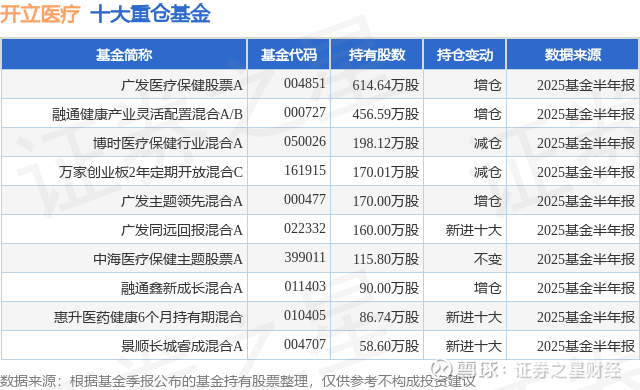根据2025基金半年报公募基金重仓股数据,重仓该股的公募基金共30家,其中持有数量最多的公募基金为广发基金的广发医疗保健股票A。广发医疗保健股票A目前规模为52.47亿元,最新净值2.1796(9月5日),较上一交易日上涨2.75%,近一年上涨42.54%。该公募基金现任基金经理为吴兴武。吴兴武在任的基金产品包括:广发轮动配置混合,管理时间为2015年2月12日至今,期间收益率为95.08%;广发医药健康混合A,管理时间为2020年10月21日至今,期间收益率为-26.91%;广发创新医疗两年持有混合A,管理时间为2021年3月19日至今,期间收益率为-8.5%。
