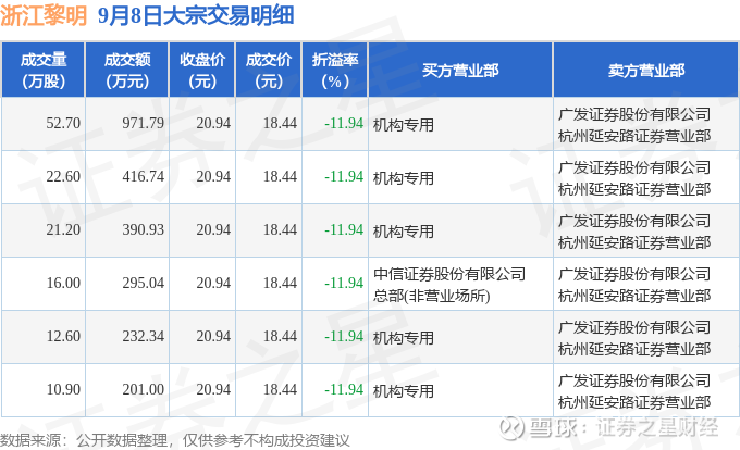 证券之星消息,9月8日浙江黎明发生大宗交易,交易数据如下: