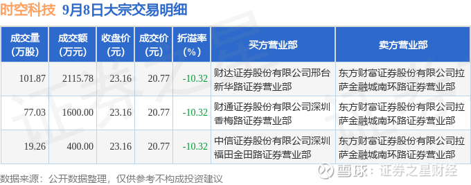 证券之星消息,9月8日时空科技发生大宗交易,交易数据如下:
