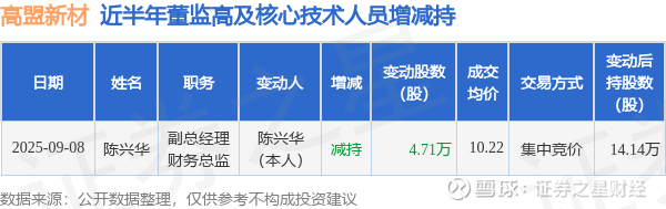 证券之星消息,根据9月8日市场公开信息、上市公司公告及交易所披露数据整理,高盟新材(300200)最新董监高及相关人员股份变动情况:2025年9月8日公司副总经理,财务总监陈兴华共减持公司股份4.71万股,占公司总股本为0.0109%。变动期间公司股价上涨1.08%,9月8日当日收盘报10.31元。