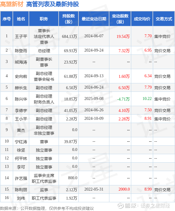 高盟新材近半年内的董监高及核心技术人员增减持详情如下: