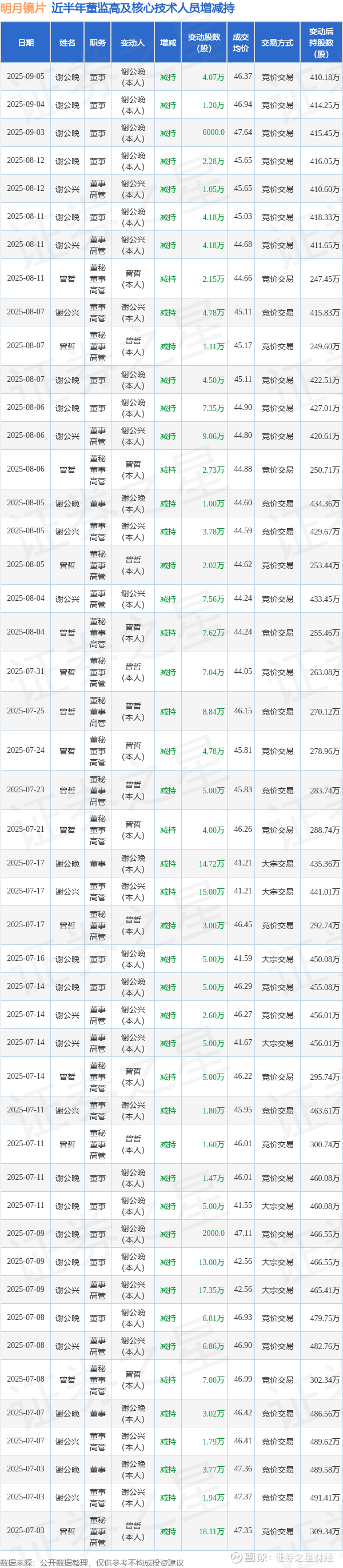明月镜片近半年内的董监高及核心技术人员增减持详情如下: