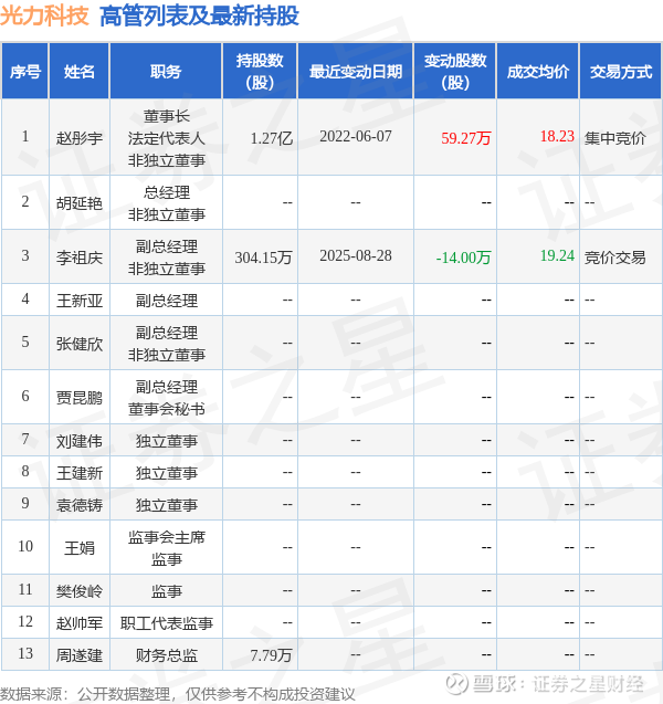 光力科技的高管列表及最新持股情况如下: