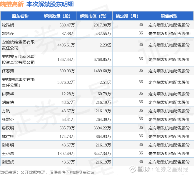 证券之星消息,根据市场公开信息整理,皖维高新(600063)于9月9日将有1.43亿股限售股份解禁,为公司定向增发机构配售股份,占公司总股本6.92%。(本次数据根据历史公告整理得出,实际情况以上市公司最新公告为准)本次解禁后,公司已无限售股份。具体如下图所示: