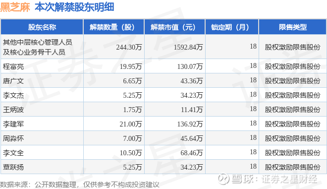 证券之星消息,根据市场公开信息整理,黑芝麻(000716)于9月9日将有321.65万股限售股份解禁,为公司股权激励限售股份,占公司总股本0.43%。(本次数据根据历史公告整理得出,实际情况以上市公司最新公告为准)本次解禁后,公司还有1448.42万股限售股份,占总股本1.92%。具体如下图所示: