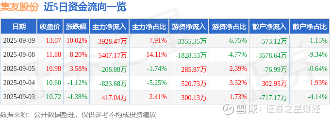 证券之星消息,集友股份9月9日涨停收盘,收盘价13.07元。该股于9点46分涨停,2次打开涨停,截止收盘封单资金为3713.09万元,占其流通市值0.54%。