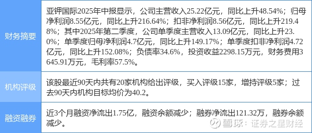 2025年8月28日,中国银河研究员孙思源发布了对亚钾国际的研报《钾肥量价齐升,25H1业绩增势强劲》,该研报对亚钾国际给出“买入”评级。研报中预计2025-2027年公司归母净利润分别为17.16、21.42、27.50亿元,同比分别变化80.50%、24.85%、28.40%;EPS分别为1.86、2.32、2.98元/股,PE分别为17.81、14.26、11.11倍。维持“推荐”评级。证券之星数据中心根据近三年发布的研报数据计算,该研报作者对此股的盈利预测准确度为53.87%。
