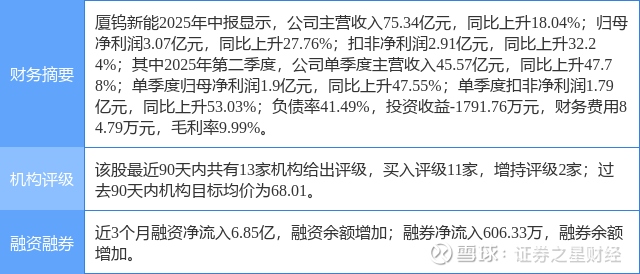 2025年8月22日,民生证券研究员邓永康,李孝鹏,席子屹发布了对厦钨新能的研报《2025年半年报点评:业绩符合预期,行业龙头地位稳固》,该研报对厦钨新能给出“买入”评级。研报中预计公司2025-2027年实现营收166.37、187.97和228.22亿元,同比增速分别为25.1%、13.0%和21.4%;归母净利分别为8.00、10.55和13.93亿元,同比增速分别为61.9%、31.9%和32.0%。2025年8月21日收盘价对应PE分别为35、26、20倍。考虑到公司技术优势明显,未来业务多曲线成长明确,维持“推荐”评级。证券之星数据中心根据近三年发布的研报数据计算,该研报作者对此股的盈利预测准确度为35.88%。