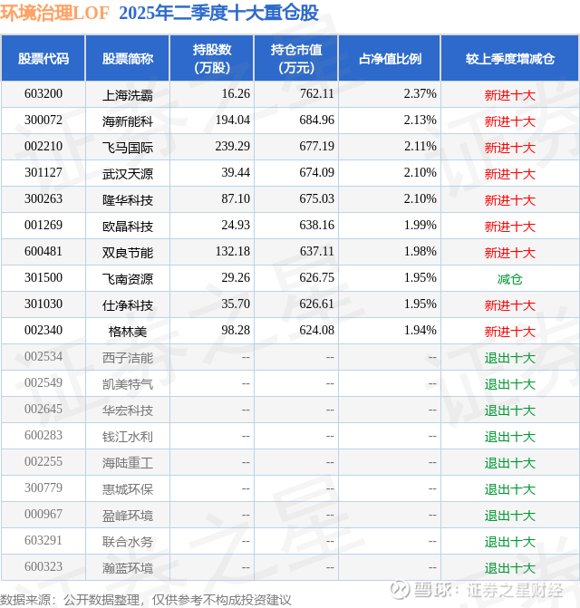 根据2025基金半年报公募基金重仓股数据,重仓该股的公募基金共2家,其中持有数量最多的公募基金为汇添富基金的环境治理LOF。环境治理LOF目前规模为2.08亿元,最新净值0.5732(9月8日),较上一交易日上涨1.25%,近一年上涨16.54%。该公募基金现任基金经理为罗昊。罗昊在任的基金产品包括:汇添富华证专精特新100指数发起式A,管理时间为2024年9月11日至今,期间收益率为74.75%;汇添富国证生物医药ETF,管理时间为2024年9月11日至今,期间收益率为46.44%;汇添富中证信息技术应用创新产业ETF,管理时间为2024年9月11日至今,期间收益率为74.87%。