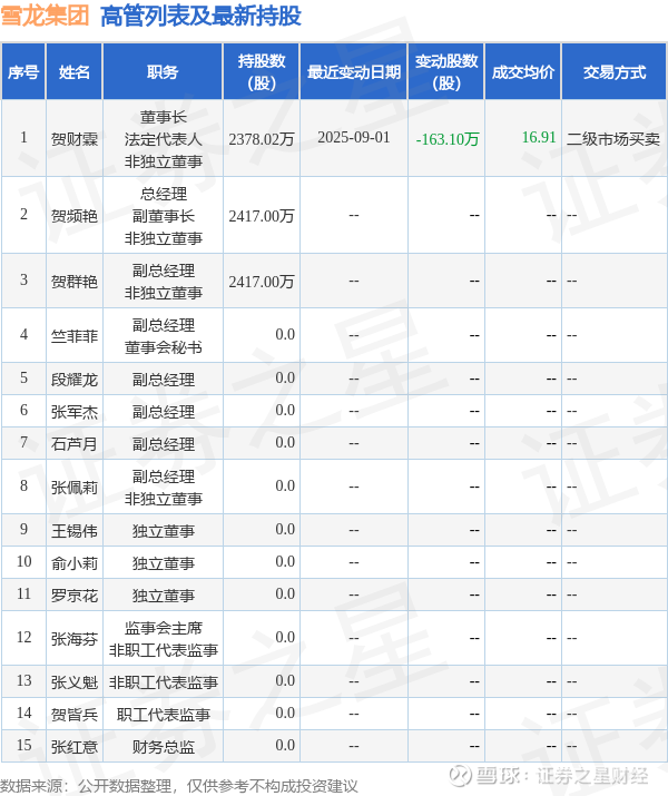 雪龙集团近半年内的董监高及核心技术人员增减持详情如下: