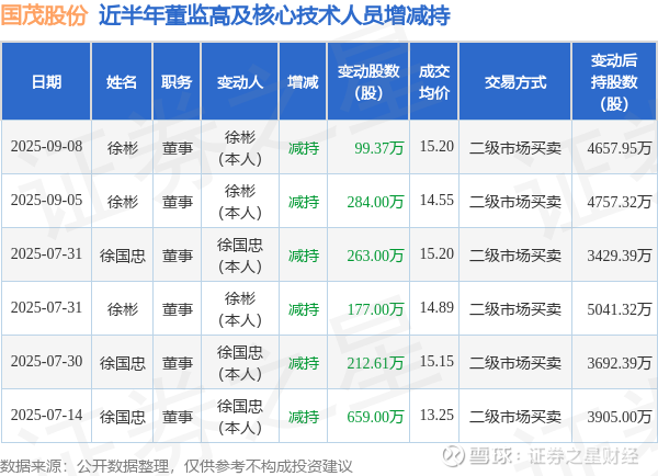 证券之星消息,根据9月9日市场公开信息、上市公司公告及交易所披露数据整理,国茂股份(603915)最新董监高及相关人员股份变动情况:2025年9月8日公司董事徐彬共减持公司股份99.37万股,占公司总股本为0.1513%。变动期间公司股价上涨3.81%,9月8日当日收盘报17.17元。