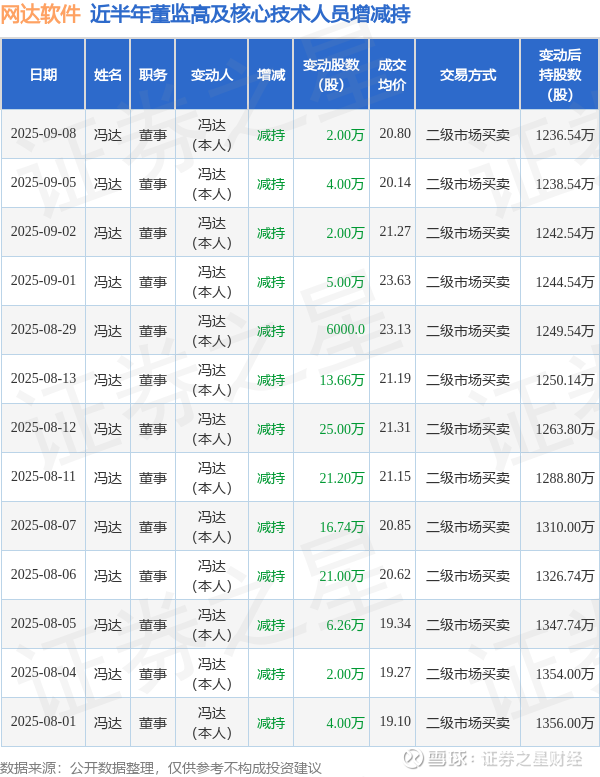 网达软件近半年内的董监高及核心技术人员增减持详情如下: