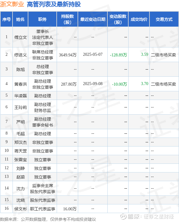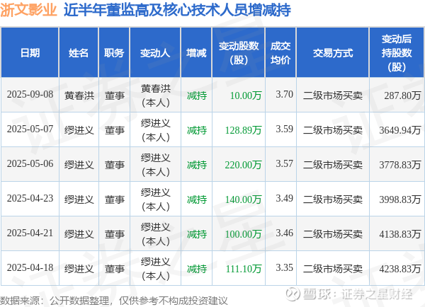 浙文影业近半年内的董监高及核心技术人员增减持详情如下: