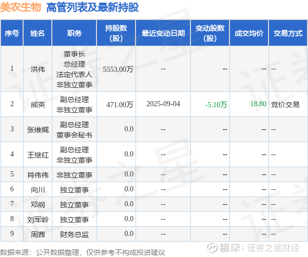 证券之星消息,根据9月9日市场公开信息、上市公司公告及交易所披露数据整理,美农生物(301156)最新董监高及相关人员股份变动情况:2025年9月8日公司董事,高管熊英共减持公司股份11.0万股,占公司总股本为0.0781%。变动期间公司股价上涨1.65%,9月8日当日收盘报19.09元。