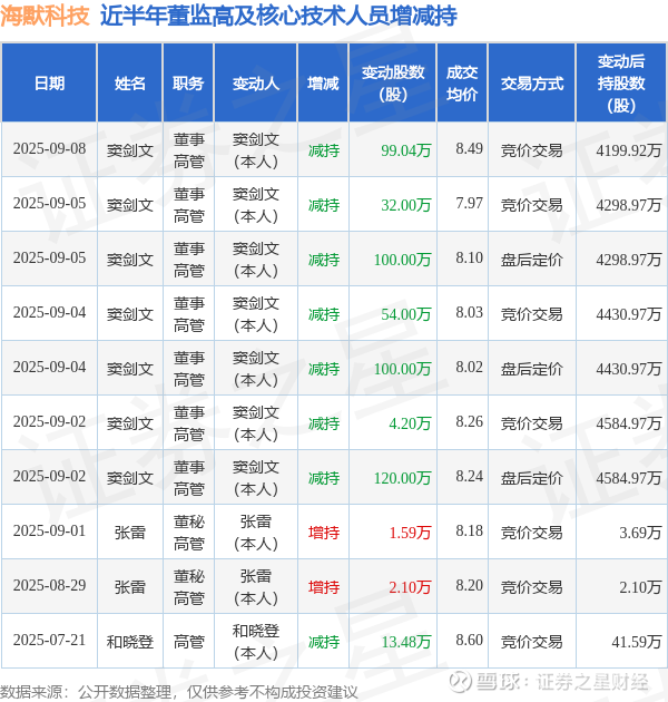 证券之星消息,根据9月9日市场公开信息、上市公司公告及交易所披露数据整理,海默科技(300084)最新董监高及相关人员股份变动情况:2025年9月8日公司董事,高管窦剑文共减持公司股份99.04万股,占公司总股本为0.1941%。变动期间公司股价上涨5.93%,9月8日当日收盘报8.58元。