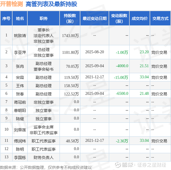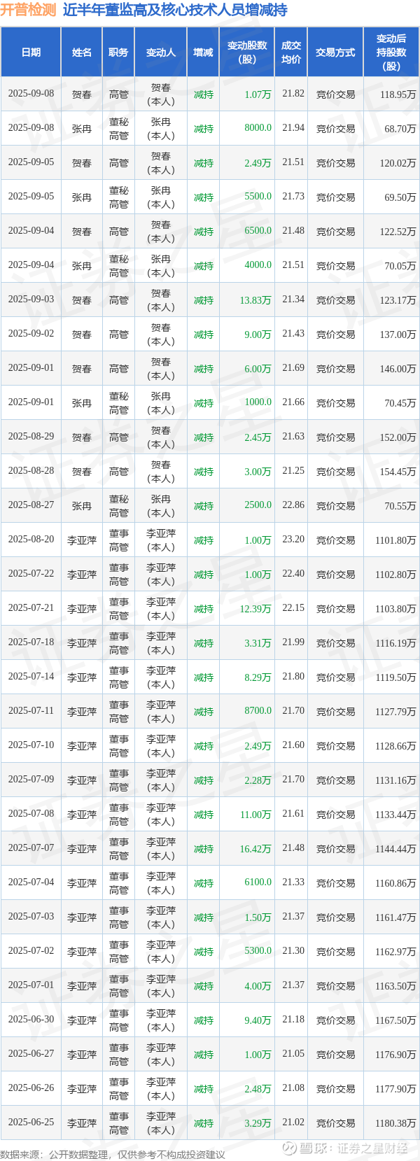 开普检测近半年内的董监高及核心技术人员增减持详情如下:
