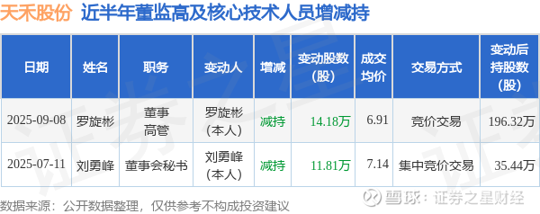 天禾股份近半年内的董监高及核心技术人员增减持详情如下: