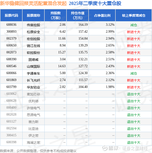 新华稳健回报灵活配置混合发起的前十大重仓股如下: