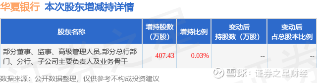 证券之星消息,9月10日华夏银行发布公告《华夏银行:华夏银行关于部分董事、监事、高级管理人员等自愿增持本行股份计划实施完毕的公告》,其股东部分董事、监事、高级管理人员,部分总行部门、分行、子公司主要负责人及业务骨干于2025年4月11日至2025年9月9日间合计增持407.43万股,占公司目前总股本的0.0256%,变动期间该股股价下跌3.83%,截止9月9日收盘报7.28元。