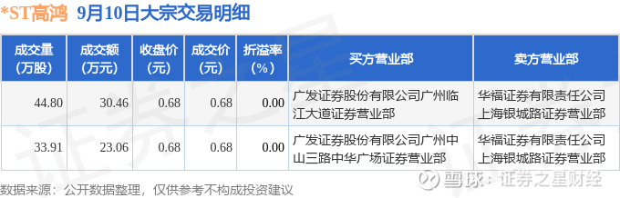 证券之星消息,9月10日*ST高鸿发生大宗交易,交易数据如下: